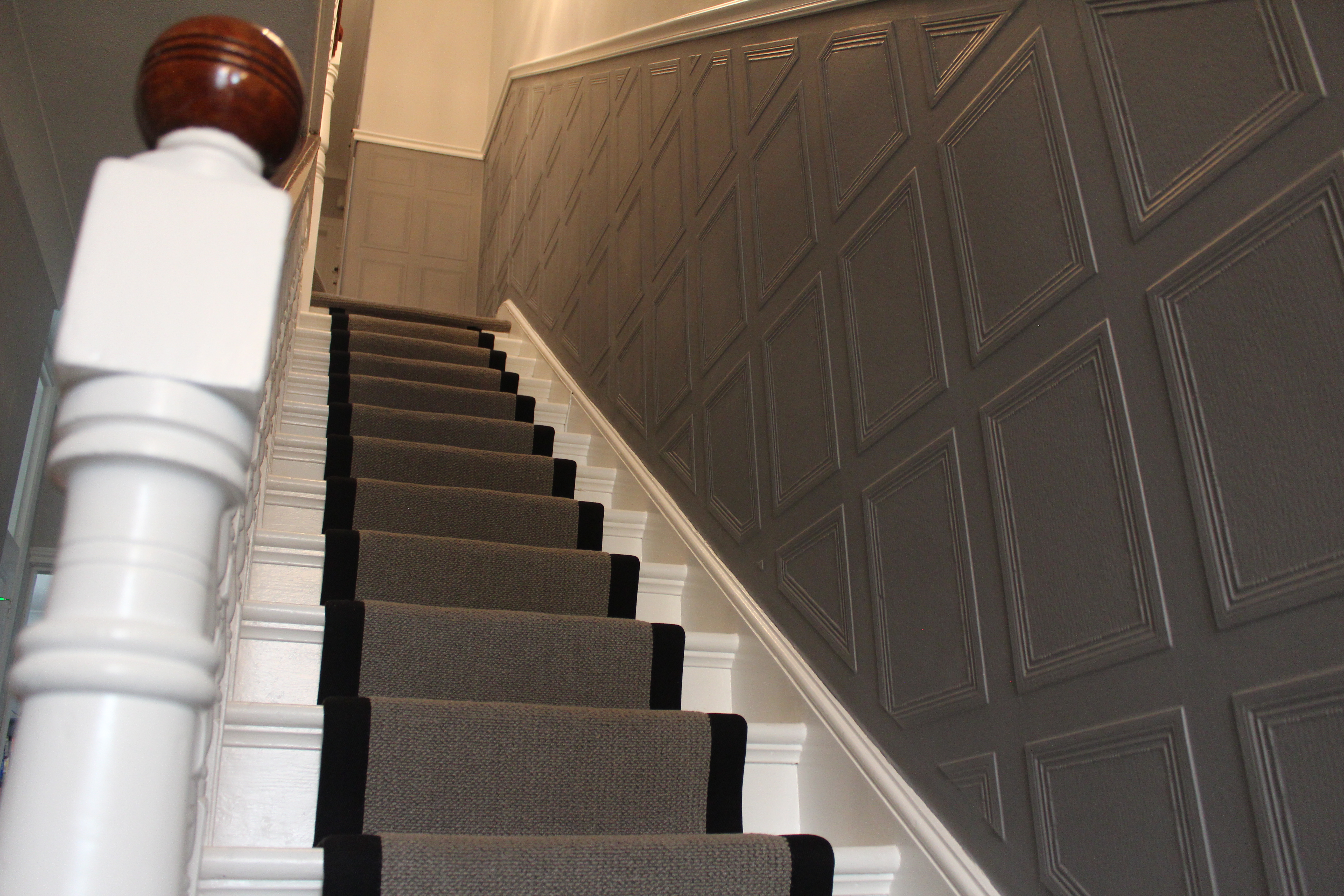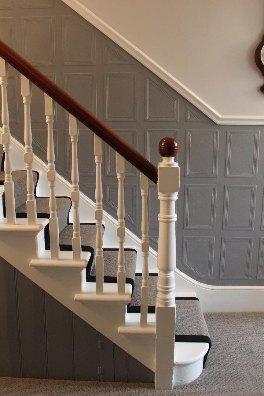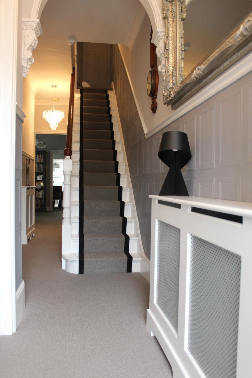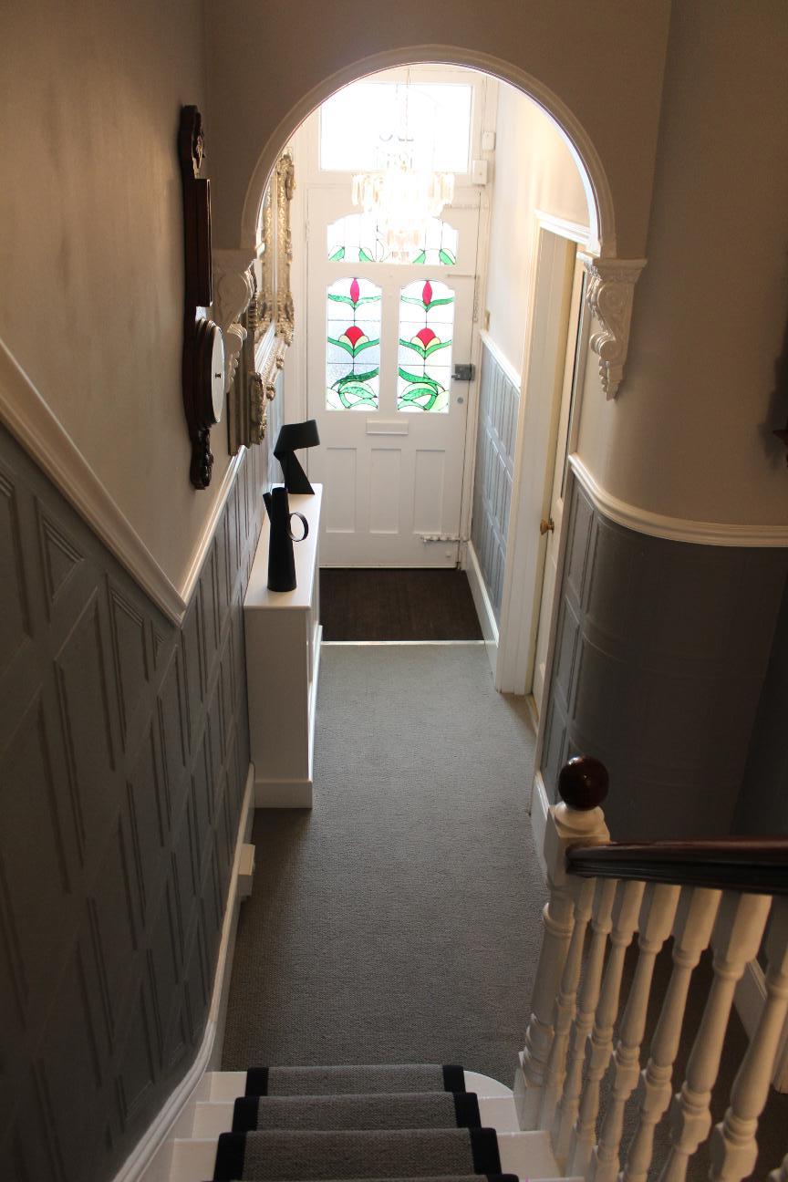 Прекрасная викторианская терраса в Чешунте в течение нескольких лет была частично отделана Lincrusta. Во время последнего ремонта на первом этаже под рейкой была выклеена Georgian panel, декорированная серым, что добавило темперамент и дань уважения архитектуре дома!
