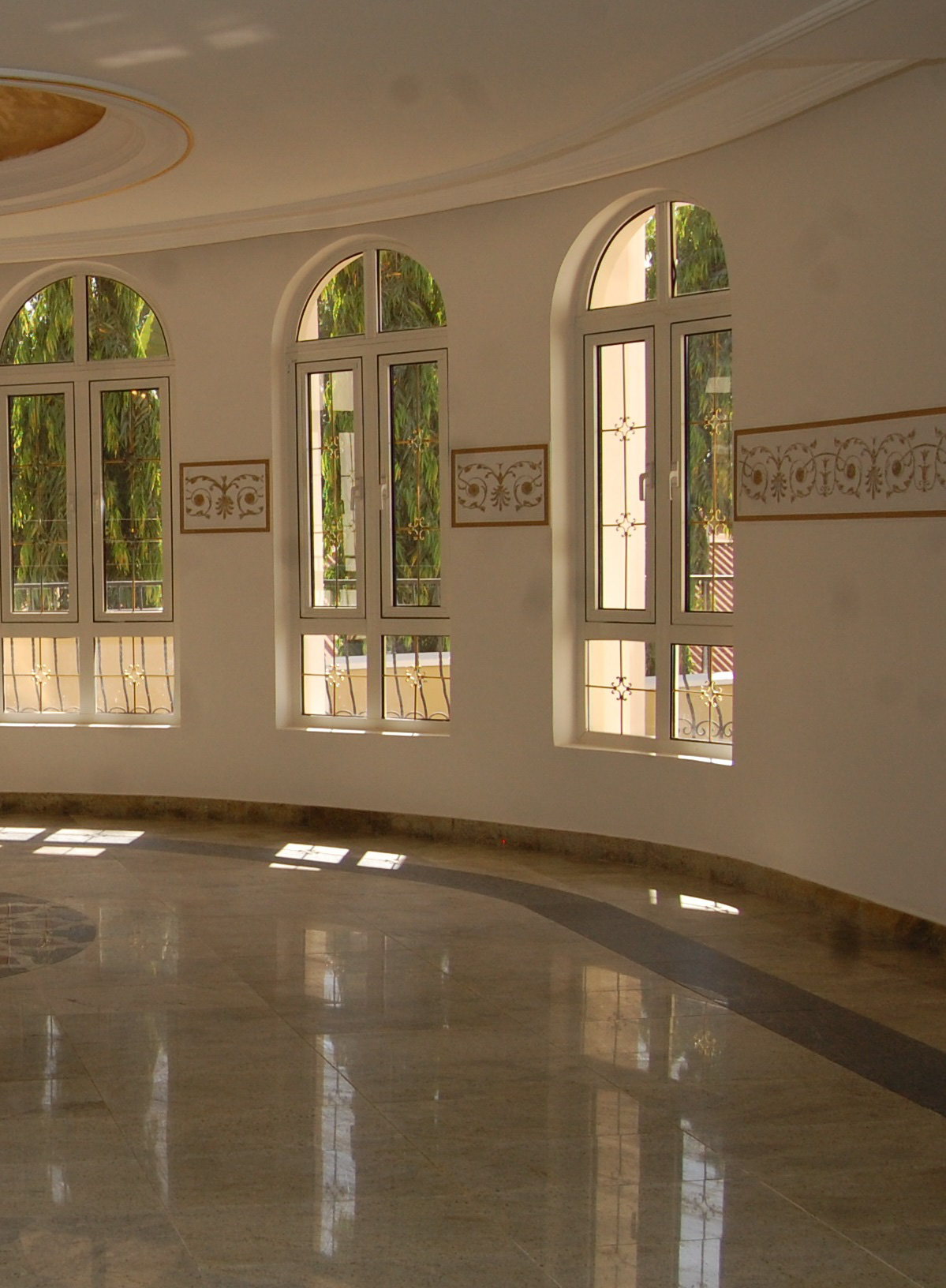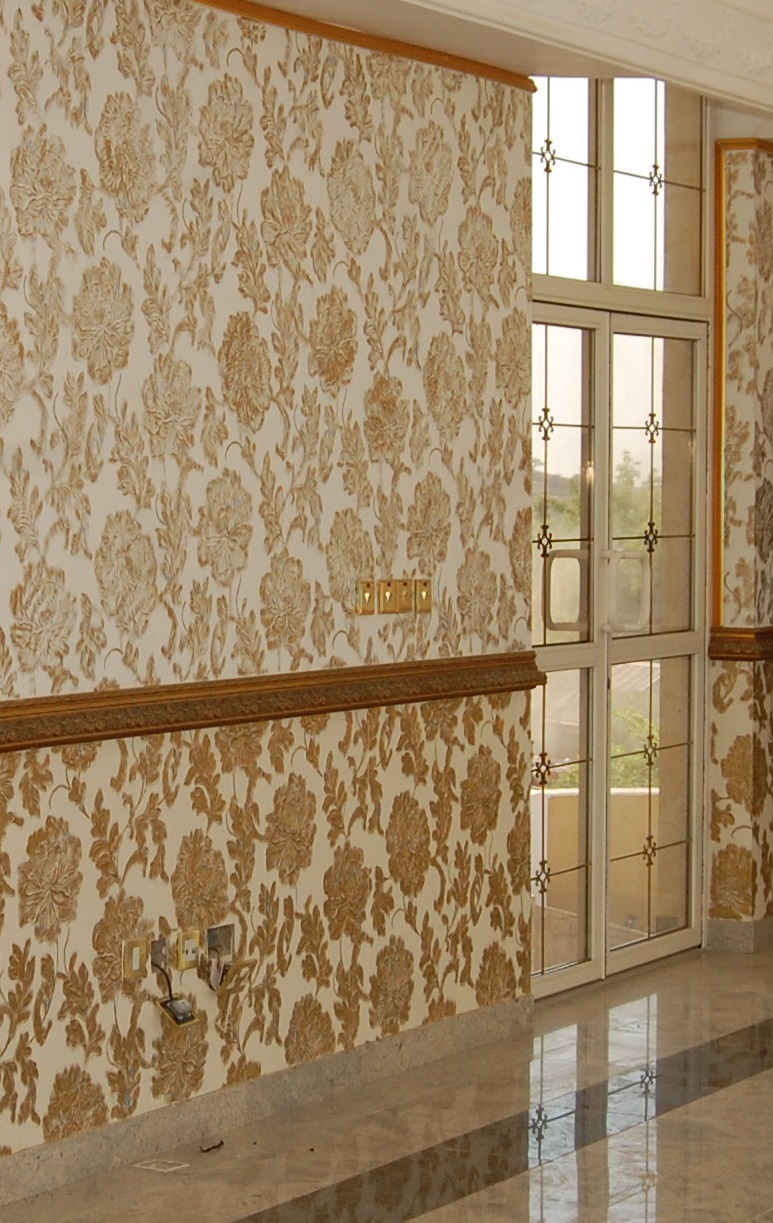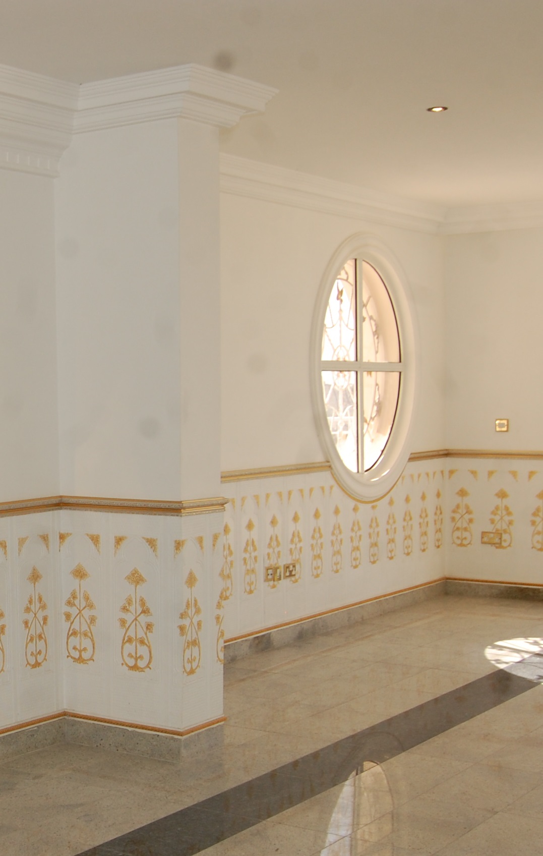 Основу дизайна составляет Gothic Dado c золотыми акцентами на белом фоне. Различные тональные контрасты подчеркивают натуру плавных линий Aphrodite в дизайне флористического оформления. Diana Frieze показывает высокий класс элегантной и изысканной отделки помещения.